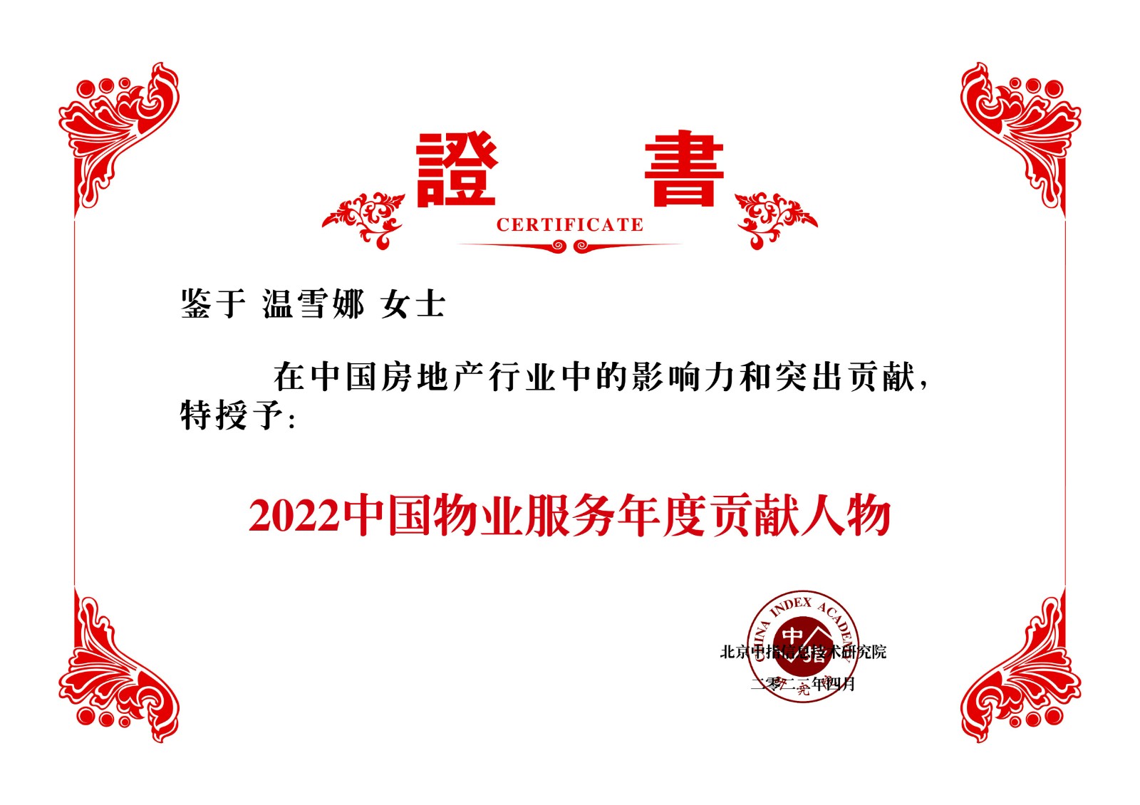 山东绿地泉物业服务有限公司总经理温雪娜荣获“2020十大新锐物业品牌人物”荣誉称号。