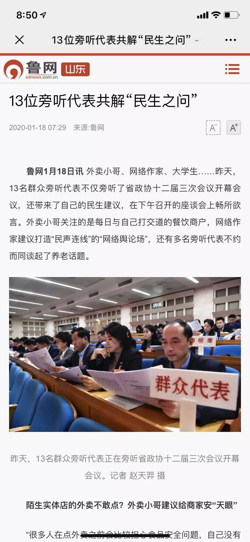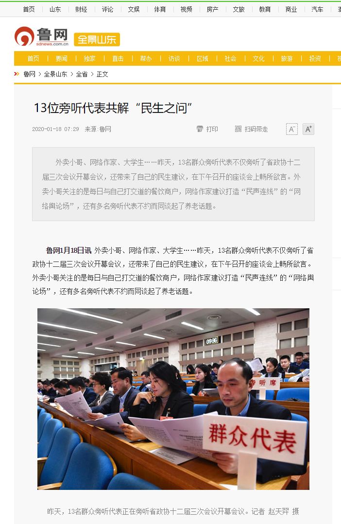 1月17日山东省政协十二届三次会议于上午9时在山东会堂开幕。温总及其他11位群众代表进行了旁听。群众代表们带着各自关于民生、政策等方面的建议,在座谈会上畅所欲言。其中,养老和乡村振兴等话题引热议。