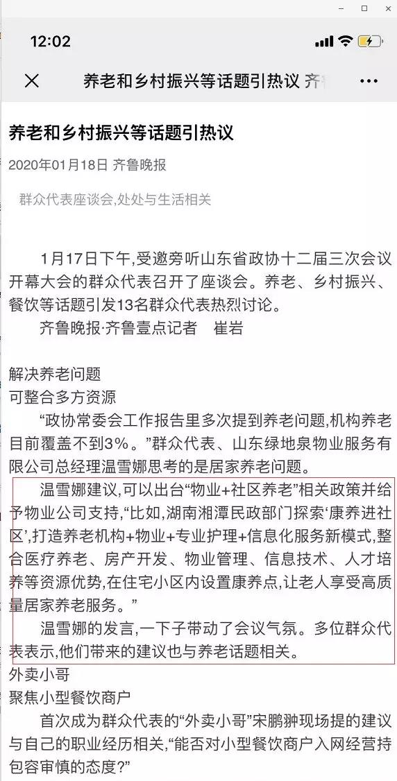 根据国内调查数据显示,目前的老年人口还是以中低龄为主,达1.66亿,高龄老人只占五分之一左右,新老年快速崛起。最近“妈妈才70岁,还可以打份工”的鸡汤文刷爆朋友圈,退休老人需要有事干,也需要存在感和目标感,也需要一份“工作”,体现自己的价值,“退而不休”成为新常态。这个年龄阶段的“活力老人”如何安老已成为不容忽视的大问题。已进入中度老龄化社会的山东应如何破解养老困局?作为旁听省政协十二届三次会议12名群众代表的一员,温总带来了来自基层的呼声——《深化物业功能打造 推动物业康养项目发展的建议》。