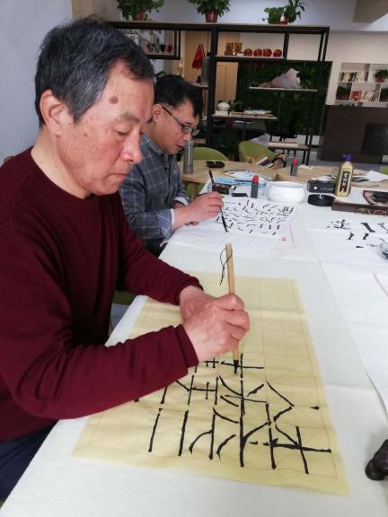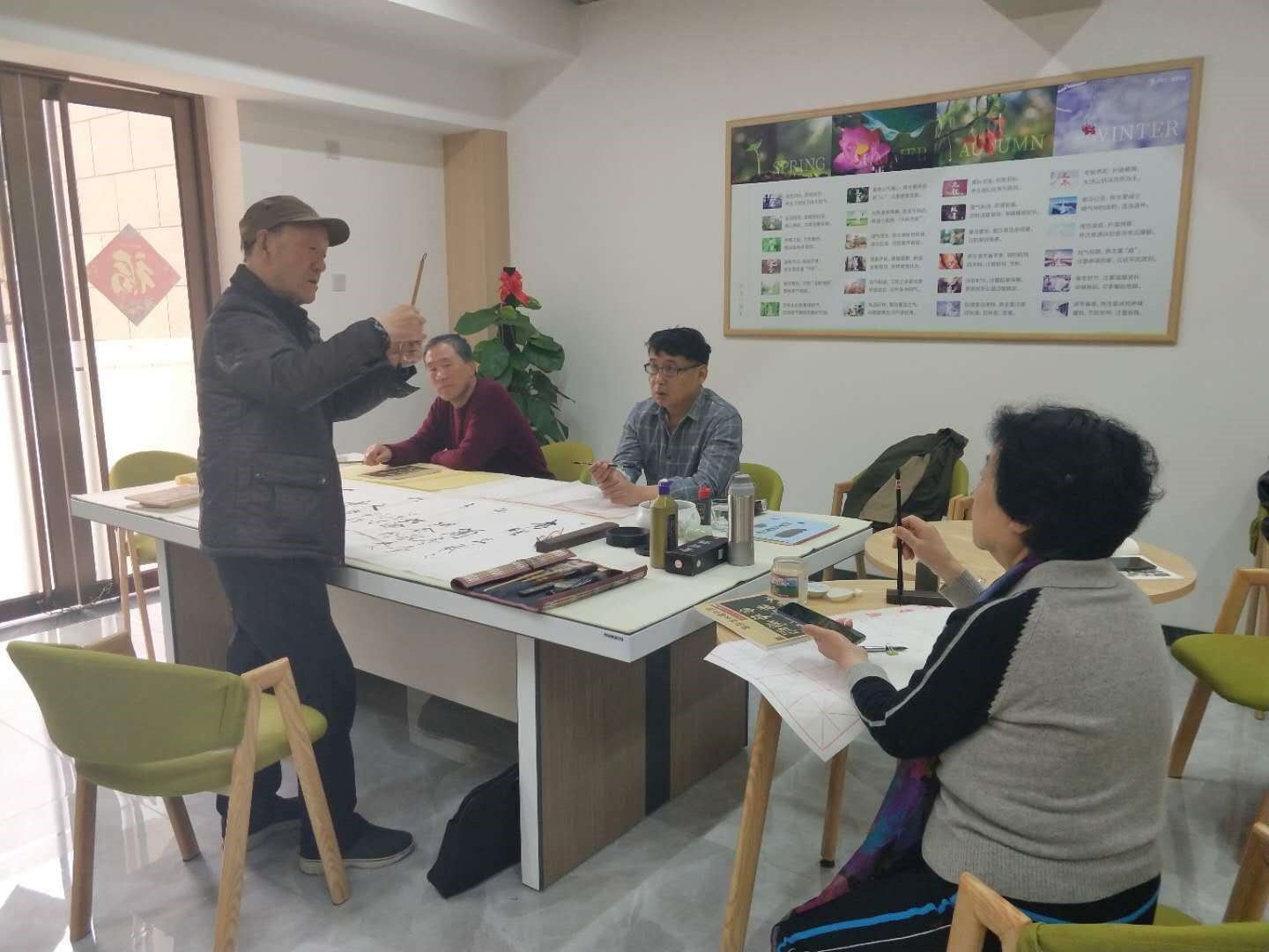 成老师先给学员们普及了书法的基本知识:了解书法作家,对王羲之以及他的代表作兰亭序、颜真卿做了简要介绍;认识中国汉字字体发展演变的过程;展示文房四宝等。