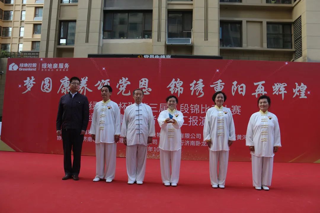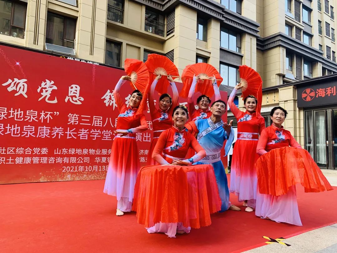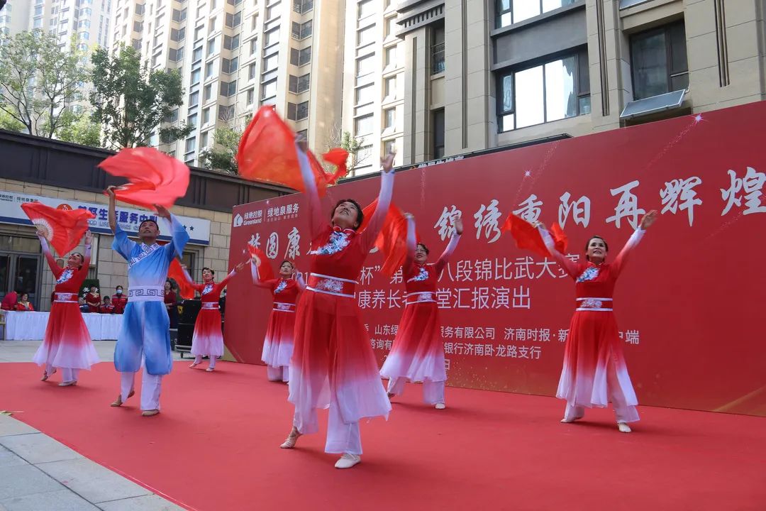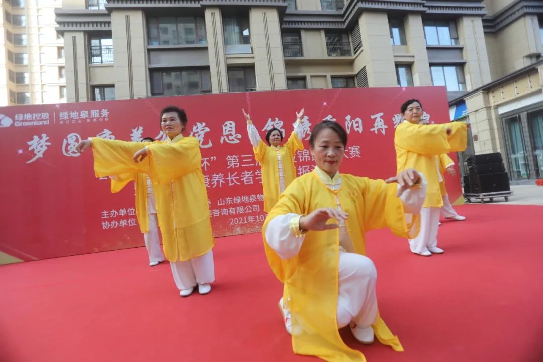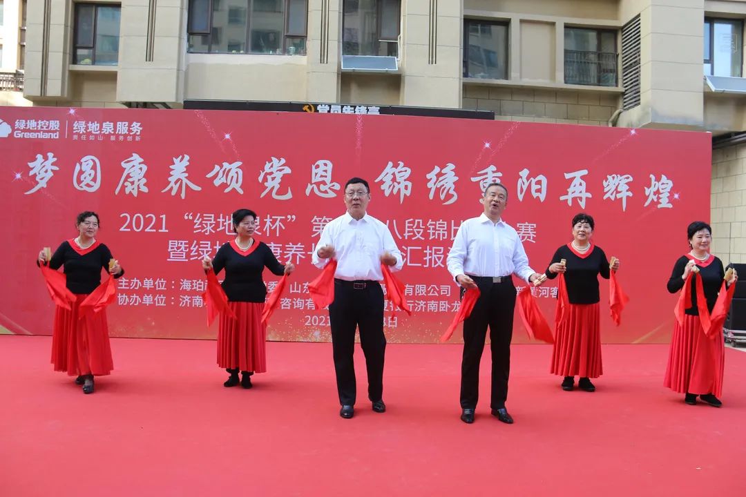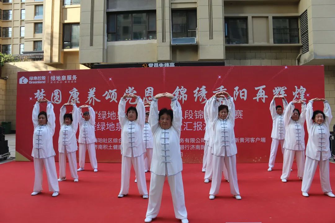 为了弘扬中国优秀传统文化,进一步推进新时代文明实践,展现绿地泉服务社区康养长者风采,2021年10月13日下午,由山东绿地泉物业服务有限公司(以下简称绿地泉服务)、七里山街道海珀社区综合党委、济南时报·新黄河客户端主办,济南积土健康管理咨询有限公司、华夏银行济南卧龙路支行协办的“梦圆康养颂党恩,锦绣重阳再辉煌”——2021“绿地泉杯”第三届八段锦比武大赛暨绿地泉康养学堂汇报演出在海珀天沅盛大举行。