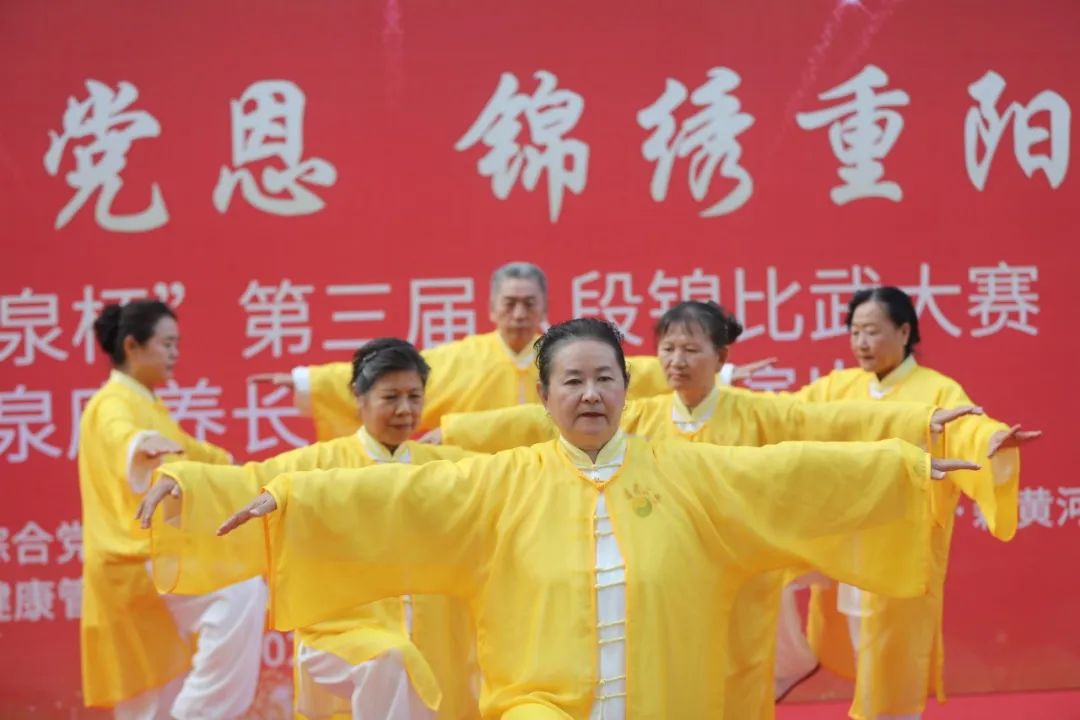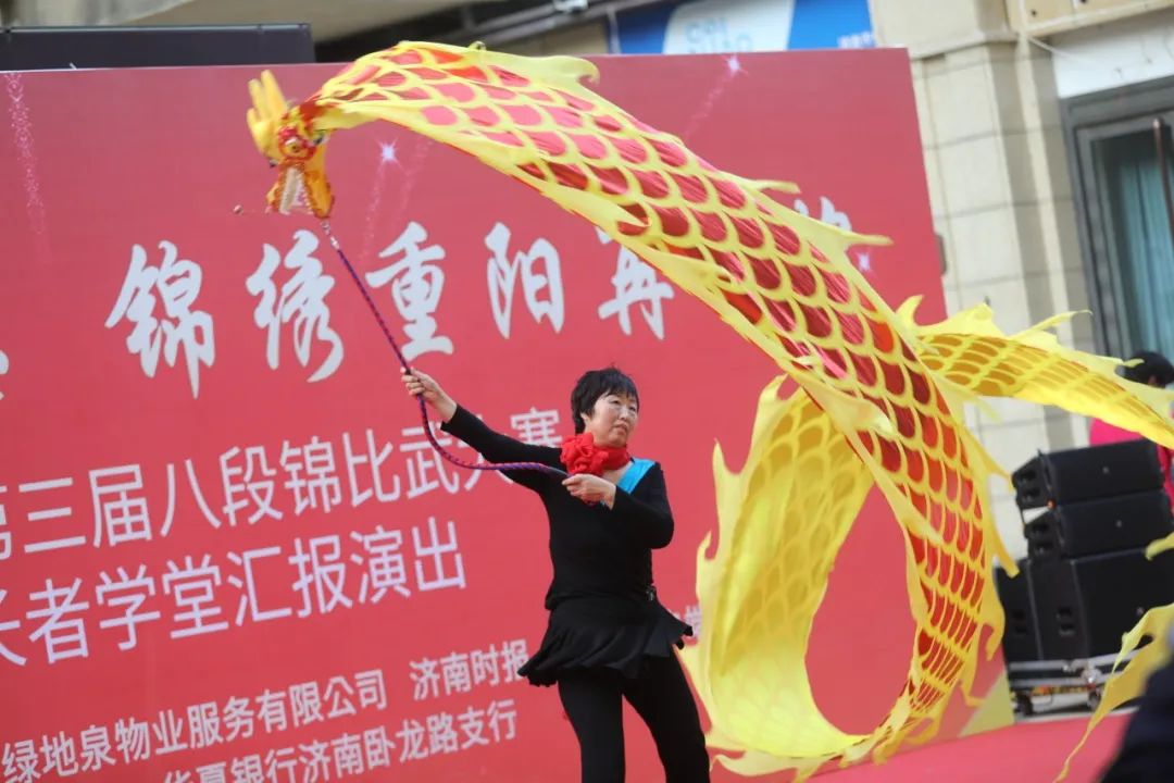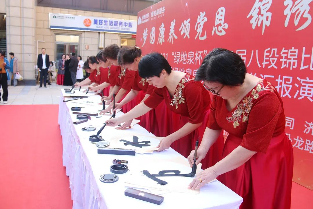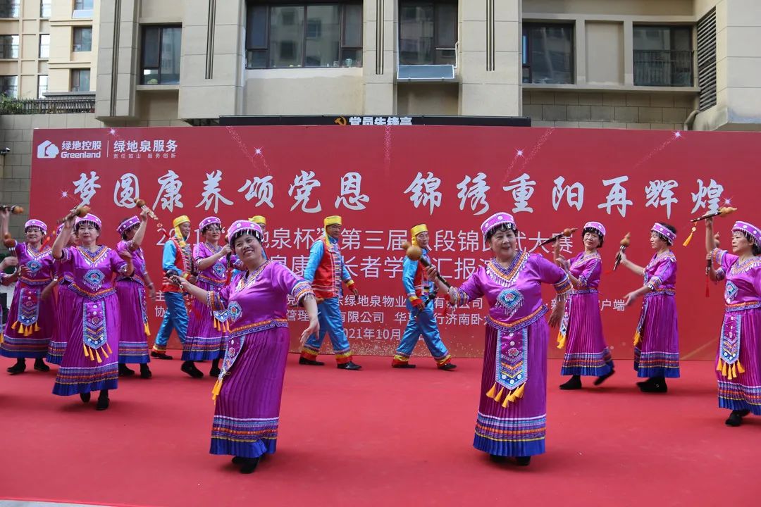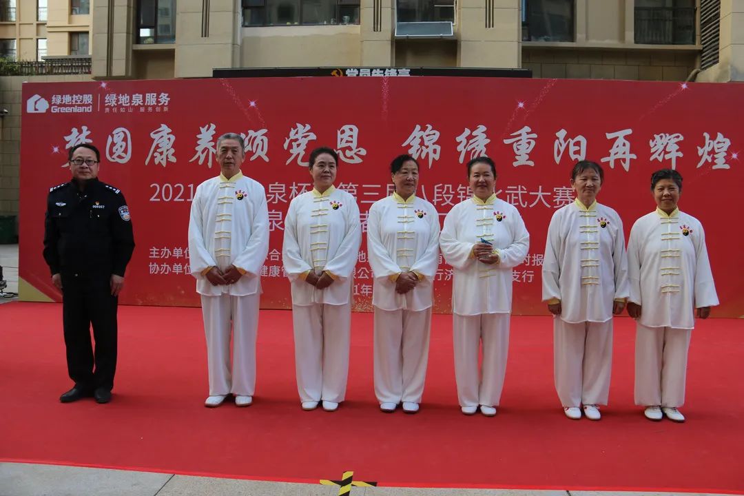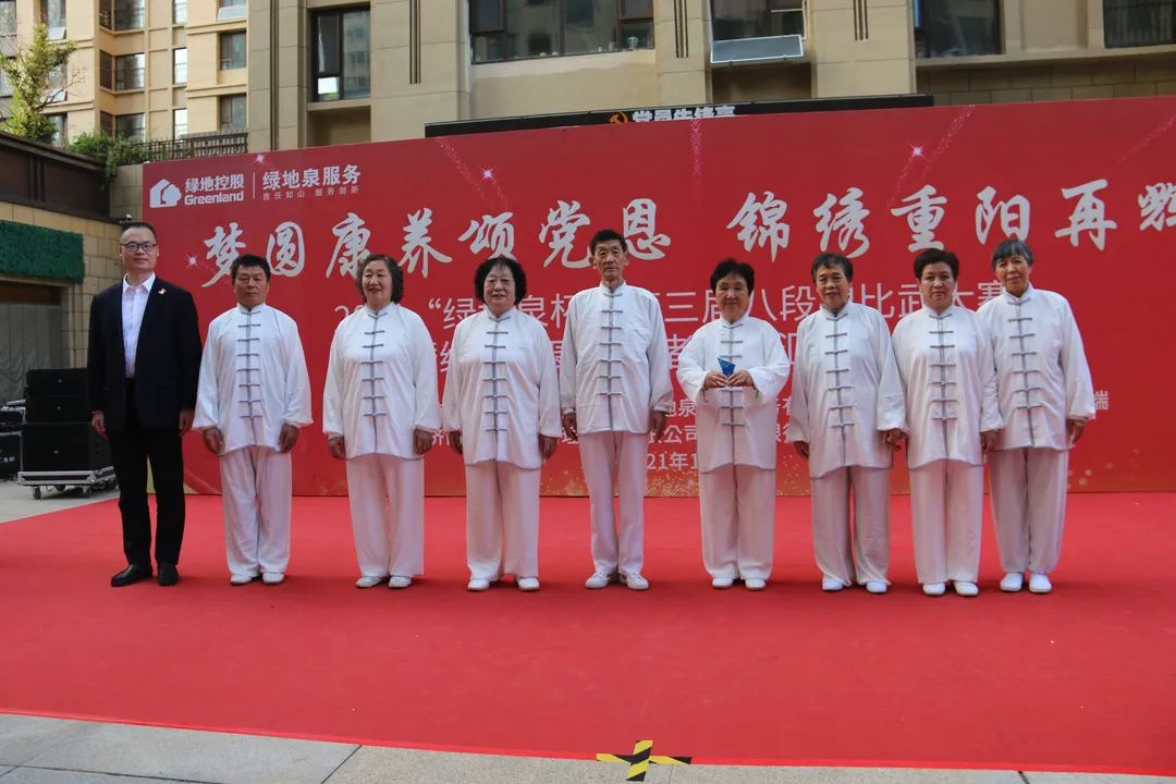 为了弘扬中国优秀传统文化,进一步推进新时代文明实践,展现绿地泉服务社区康养长者风采,2021年10月13日下午,由山东绿地泉物业服务有限公司(以下简称绿地泉服务)、七里山街道海珀社区综合党委、济南时报·新黄河客户端主办,济南积土健康管理咨询有限公司、华夏银行济南卧龙路支行协办的“梦圆康养颂党恩,锦绣重阳再辉煌”——2021“绿地泉杯”第三届八段锦比武大赛暨绿地泉康养学堂汇报演出在海珀天沅盛大举行。