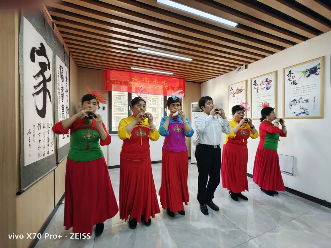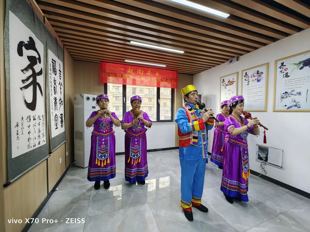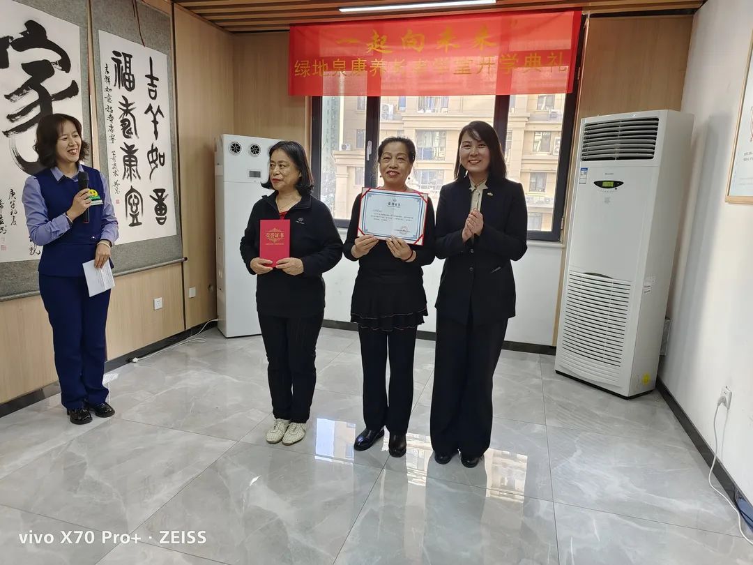 七里山街道办事处便民服务中心主任陈慧琪、海珀社区综合党委书记王娟、绿地泉物业服务有限公司总经理温雪娜及康养长者学堂学员等60余人莅临现场参加开学典