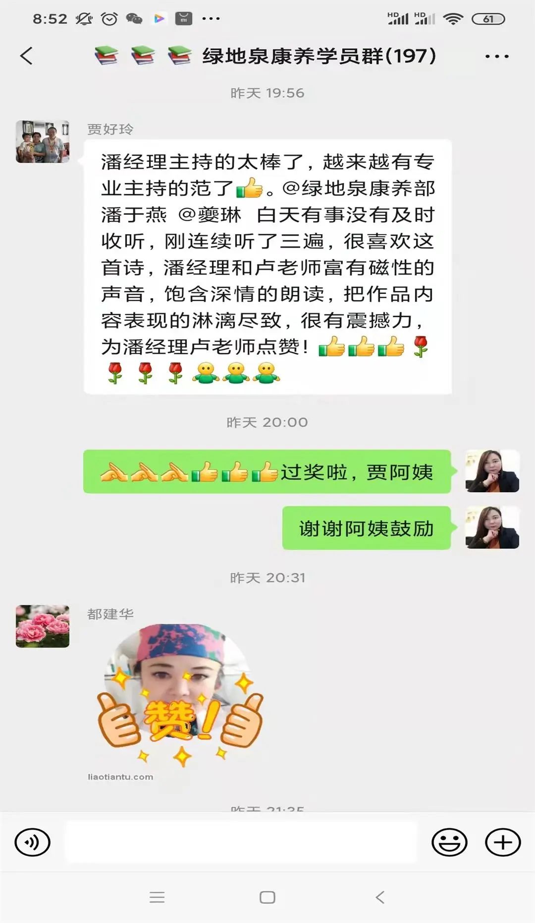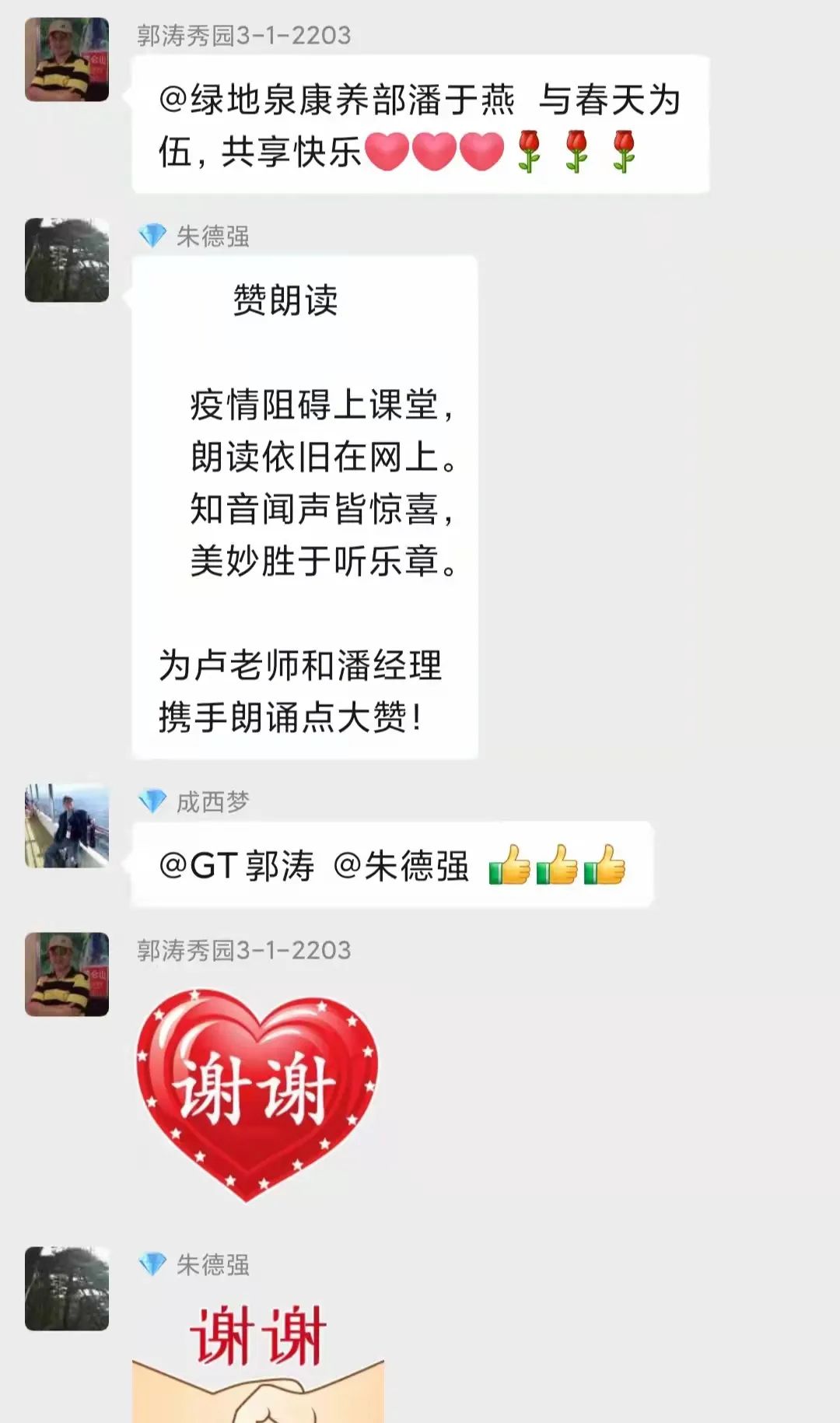 用我们的声音传递美好,用文字的力量带动更多的人成为朗读者,让我们在阅读中一起成长,使我们的生活丰富多彩。近期因受省内疫情影响,为确保各位业主家人的健康安全,丰富业主的居家乐趣,康养部再次将线上作为主阵地。3月16日,绿地泉康养长者学堂线上微课堂《我是朗读者》第三季正式启动。朗读展示风采,文字映照心灵,通过线上微课堂,不仅丰富了业主家人的精神文化生活及身心健康,还用康养服务点缀幸福生活。《我是朗读者》线上微课堂每周一期,期期都得到家人们的热情关注和厚爱,参与关注收听的业主达三百余人,精彩点评更是把微课堂推向高潮!