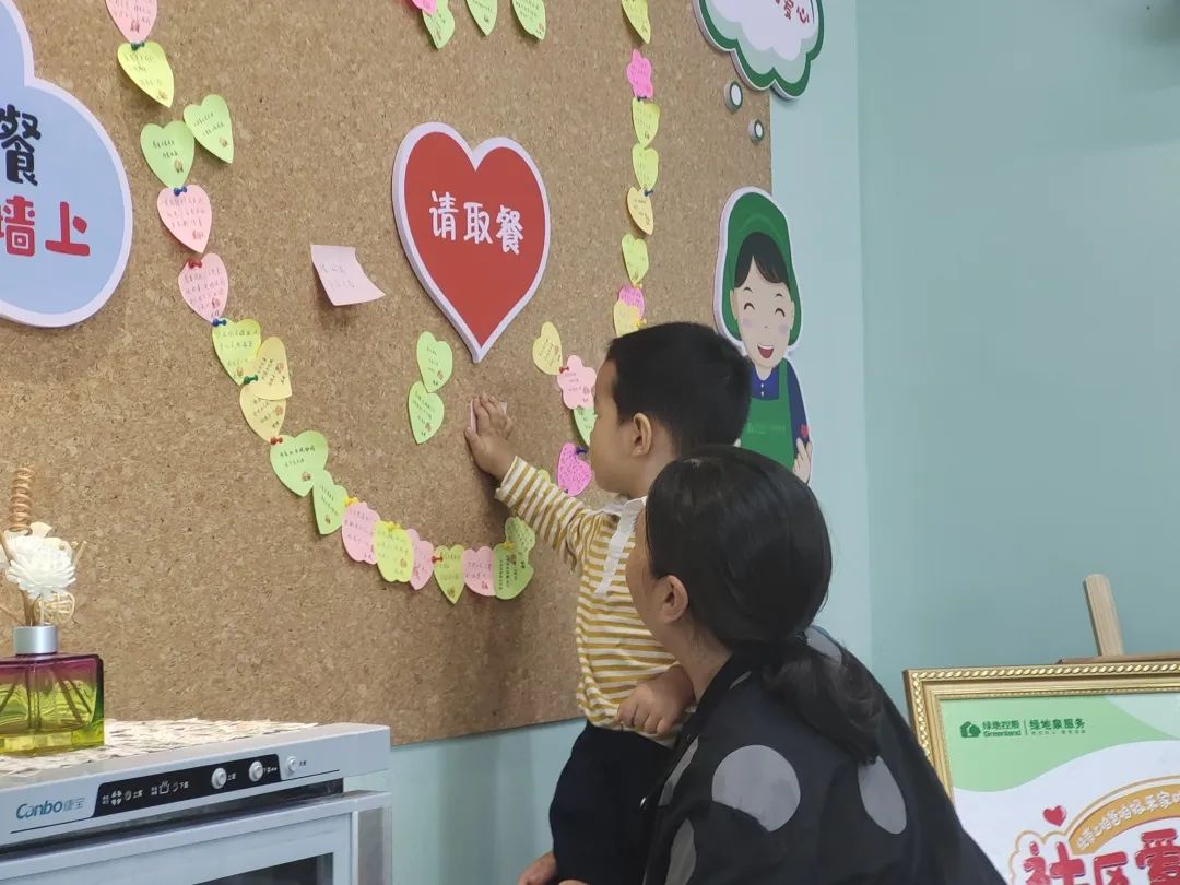 伴随着饭菜香,业主李阿姨带着小外孙来到食堂点了一份套餐,但在付钱的时候却支付了双份的费用,还在便利贴上写了一句温暖的话,由小外孙亲自贴在爱心墙上。