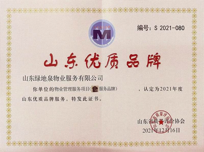 2021年12月16日,山东省质量评价协会2021年度“山东优质品牌”评选揭晓,公布了2021年度山东优质品牌服务的认定名单。山东绿地泉美好生活服务集团旗下山东绿地泉物业服务有限公司(以下简称:绿地泉服务)继2020年获此殊荣之后再传喜讯,荣获2021年度“山东优质品牌服务”荣誉称号。